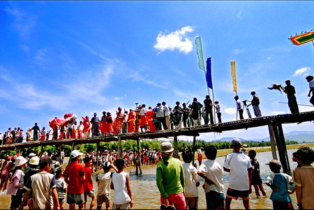Quang cảnh Hội Đổ Gian tại An Thái - Rước nước Thánh từ sông Côn về Ngũ Bang Hội quán - địa điểm diễn ra Hội Đổ giàn. Ảnh Đào Tiến Đạt